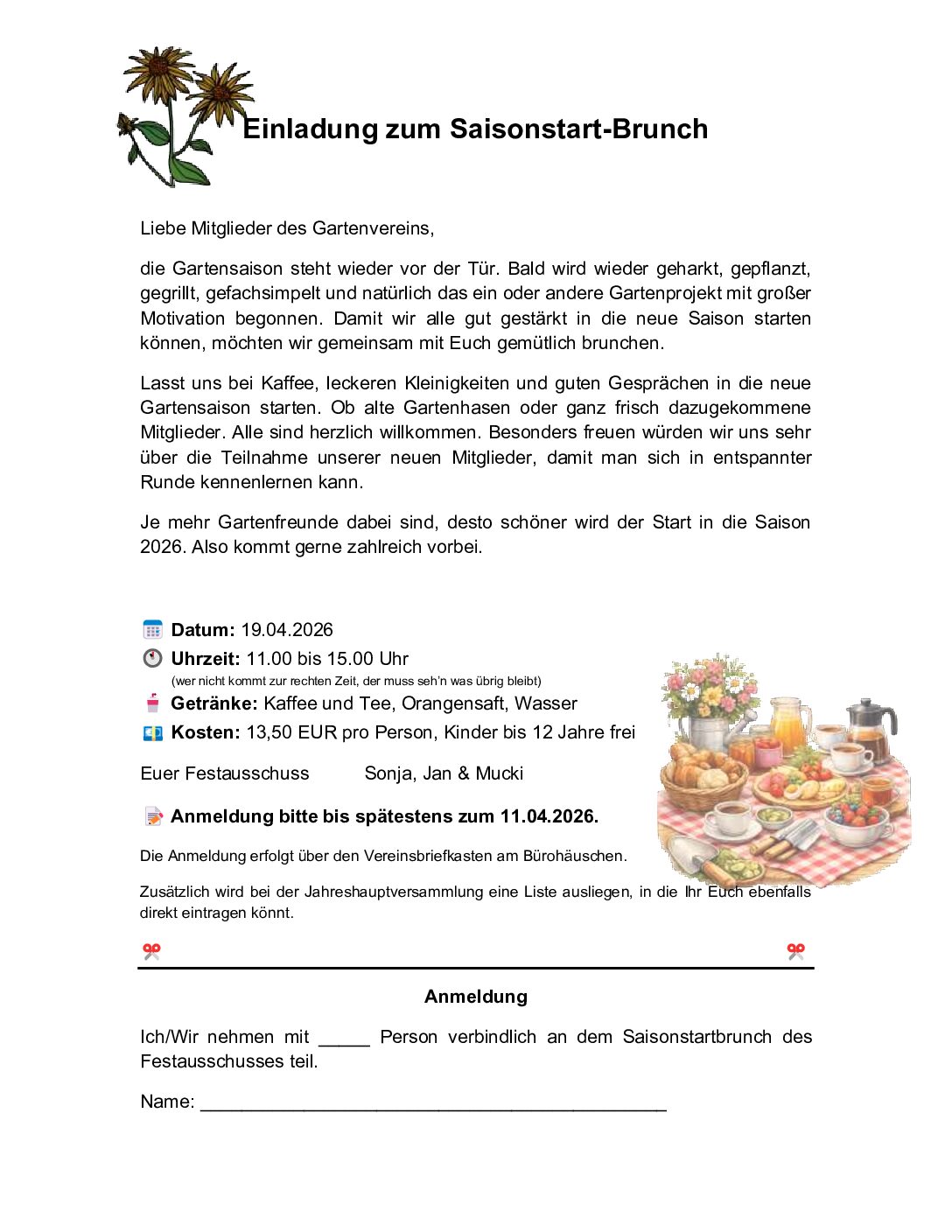 Liebe Mitglieder des Gartenvereins,die Gartensaison steht wieder vor der Tür. Bald wird wieder geharkt, gepflanzt, gegrillt, gefachsimpelt und natürlich das ein oder andere Gartenprojekt mit großer Motivation begonnen. Damit wir alle gut gestärkt in die neue Saison starten können, möchten wir gemeinsam mit Euch gemütlich brunchen. Lasst uns bei Kaffee, leckeren Kleinigkeiten und guten Gesprächen in die neue Gartensaison starten. Ob alte Gartenhasen oder ganz frisch dazugekommene Mitglieder. Alle sind herzlich willkommen. Besonders freuen würden wir uns sehr über die Teilnahme unserer neuen Mitglieder, damit man sich in entspannter Runde kennenlernen kann. Je mehr Gartenfreunde dabei sind, desto schöner wird der Start in die Saison 2026. Also kommt gerne zahlreich vorbei.